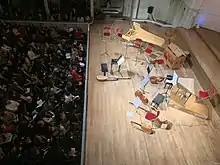 The hall opened its doors on 3 October 1907 for the concert of the Lehrergesangverein (Teachers' Choir of the city of Bremen with one hundred and forty performers). It immediately became a prestigious hall. Camille Saint-Saëns' concert in the Salle Gaveau [audience and orchestra from the stage];[4] then other famous musicians gave concerts there from the first months after the opening. The concerts Lamoureux, conducted by Camille Chevillard, Vincent d'Indy and André Messager, moved to Gaveau. On 5, 8 and 12 November 1907, Alfred Cortot, Jacques Thibaud and Pablo Casals performed the complete trios by Beethoven. In the following years, the Salle Gaveau hosted Eugène Ysaÿe (21 January 1908), Lazare-Lévy (27 January 1909), Marguerite Long[5] (11 December 1911), Georges Enesco (8 February 1912), Fritz Kreisler (21 and 28 April 1912), Wilhelm Backhaus (15 May 1912), Claude Debussy (5 May 1917).[6]