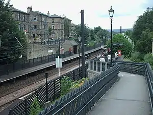 The original station was opened in May 1856 by the Midland Railway, which had absorbed the Leeds and Bradford Extension Railway between Shipley and Colne in 1851. It closed on 20 March 1965 following the Beeching Axe, but West Yorkshire Passenger Transport Executive and British Rail reopened it on 9 April 1984, at a cost of £139,000 (equivalent to £475,300 in 2021).[1][2] The current station has wooden platforms and waiting shelters (though these are stone-built rather than the metal and plexiglass designs used elsewhere). Its predecessor was of more substantial stone construction, with buildings on each platform; these were demolished in 1970, five years after the station closed.[3]