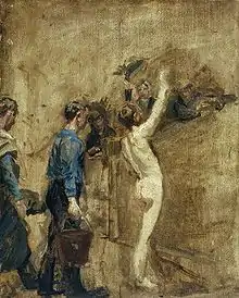 Eakins also completed an oil-on-canvas study, which he gave to art critic Sadakichi Hartmann after Hartmann praised Eakins in his 1901 book A History of American Art. (This was the first time Eakins had been recognized as being of historic importance.)[6] This study is now in the possession of the Carnegie Museum of Art.[7][8]