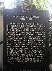Salvador Araneta y Zaragoza (January 31, 1902 โ October 7, 1982) was a Filipino nationalist, constitutionalist, politician, civil servant, lawyer, educator, economist, businessman, industrialist, environmentalist, and philanthropist.