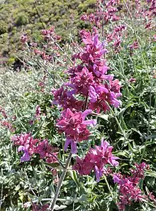 Salvia canariensis, the Canary Island sage, is an erect perennial shrub native to the Canary Islands. It can reach 2.0–2.3 m in height and 1.5 m width in a single season. The hastate leaves are pale green, and the stems and underside of the leaves are covered with long white hairs. The flowers range from pale purple to deep purple magenta.[1]