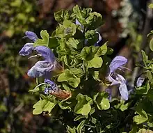 It grows 6 ft (1.8 m) tall in its native habitat, less in cultivation, with unusual (for the Salvia family) round stems. The aromatic gray-green leathery leaves are small (.5 in (1.3 cm)) and tightly packed. The short 2 in (5.1 cm) inflorescence is tightly packed with whorls of 1 in (2.5 cm) flowers that range in color from pale blue to light lavender. As the calyces age they expand and turn pink, complementing the color of the flowers.[1]