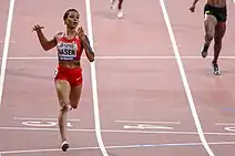 On 3 October 2019, Naser became the 400 metres world champion at the Doha World Championships in Qatar, the youngest ever, and also the first Asian female winner of that title. She improved her personal best, set one year earlier, by a massive 0.94 s, and her result of 48.14 seconds had been the fastest since 1985 – that is for 34 years (when Marita Koch set a world record of 47.60), the second-fastest at a World Championships (only behind Jarmila Kratochvílová who ran 47.99 in 1983), and the third-fastest of all time.[19][32] This had been her fifth race in five days and top five women all set PBs.[32][24] She additionally took the bronze medal for the 4 × 400 m mixed relay, which set an Asian record. During 2019 Military World Games, the sprinter finished as the gold medallist in her signature event extending her unbeaten streak in the event to 14 straight finals, and a bronze one in the 4 × 100 m relay.[33] Naser finished the 2019 season unbeaten.[1]