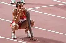 In May 2015, she confirmed herself as the continent's best 400 m runner in her age group with a gold medal at the Asian Youth Championships.[14] In June while in Bulgaria, she set national junior records in the 100 m and 200 m, clocking 11.70 s and 23.03 s respectively.[9] Eid Naser then proved herself among the best globally in the 400 m at the World Youth Championships. A patient run in a tight hijab, what was her own decision, saw her overhaul the more favoured American Lynna Irby in the final stages of the race, and she achieved a lifetime best of 51.50 s to take the gold medal.[10] The final came on the day after Ramadan which allowed her to eat normally before the race, after having fasted during the qualifying rounds.[9] The gold medal made her the second ever Bahraini woman to win a global-level title, after senior world champion Maryam Yusuf Jamal.[15] Her tactical running was praised by USA's decathlon world record holder Ashton Eaton, who invited her on an all expenses paid trip to train with him for three days.[16]
