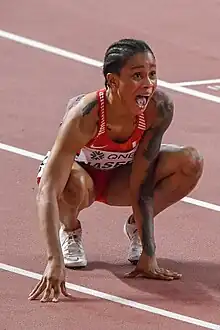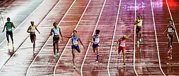 While still a junior, Salwa Eid Naser claimed the silver medal in the 400 m event at the 2017 London World Championships with a new personal best of 50.06 seconds, after winning and each time improving in her heat and semi-final, finally lowering her personal best by a massive 0.82 s.[24] The final took place on a wet surface during light rain. She was last midway through the race and when she turned for home she was still only fourth, eventually beating Allyson Felix by 0.02 and being beaten only by Phyllis Francis (photo finish). Shaunae Miller-Uibo had been leading until the last 30 metres when she got the staggers and dropped from first to fourth.[25] At age 19, it made Naser the youngest woman ever to reach the podium over 400 m at a World Championships; she also thrice broke the Bahraini national record.[20][6] Less than two weeks later, she won in the distance at the Diamond League meeting in Birmingham, and then set even better personal best of 49.88 s in Brussels a week later, securing second place overall in the Diamond Race.[6] This result, the third-fastest world under-20 time in history and an Asian U20 record, would have given her first place in London.[26][19]