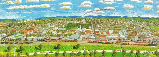 From his childhood, Byrne had a fascination with maps and mapmaking.[35] The works produced at the beginning of his artistic career are reminiscent of cartographic style.[84] The cartographic impulse continued through his oeuvre, manifesting in his use of line, colour, his feel for space and his interest in the man made aspects of the desert landscape such as railway tracks and roads.[85] His earliest documented paintings, dating from the late 1950s, take the form of detailed, large-scale panoramas of the Broken Hill township as it appeared from above. The works bear a striking resemblance to the early topographical drawings of Australia's colonial settlements.[86] There is a focus on technical observedness, reflecting Byrne's desire to document his township exactly as he saw it, without taking any artistic liberties. Despite the need for accuracy, Sam Byrne never painted his townscapes en plein air.[51] Instead he preferred to make pencil sketches on location directly onto the masonite, noting down colours.[8] He would then paint over them at home, where he worked in an old tin laundry on the side of his house.[21] To achieve the detailing on distant buildings and trees, the artist used a technique similar to pointillism.[86] Author Geoffrey Lehman describes the technique as "miniaturisation", observing that the tiny houses "congregate and accrue like a colony of coral polyps."[87] Taking up to 3 months to complete, fewer than ten panoramas are thought to have been created. Byrne would later suffer from failing eyesight and, out of physiological necessity, move on to subjects less concerned with microscopic finesse and the conventions of technical draughtsmanship.[88]