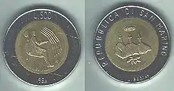 The lira (plural lire; abbreviation: SML) was the currency of San Marino from the 1860s until it was replaced by the euro on 1 January 2002. It was equivalent and pegged to the Italian lira.[1] Italian coins and banknotes and Vatican City coins were legal tender in San Marino, while Sammarinese coins, minted in Rome, were legal tender throughout Italy, as well as in the Vatican City.