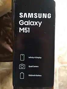The Samsung Galaxy M51 is a mid-range Android smartphone manufactured by Samsung Electronics as part of their M series. It was announced in late August 2020 and released the following month. The phone has a 6.7 in sAMOLED Plus display, a 64 MP quad-camera setup, and a 7000 mAh battery. It is primarily derived from the Samsung Galaxy A71 in terms of design and specifications.
