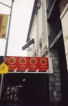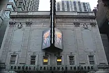 The facade is designed in the Italian Renaissance Revival style with low-relief classical ornamentation. It is made of glazed white brick with white terracotta decorations.[16][17] The first story of the facade is symmetrically arranged and is faced with rusticated terracotta blocks. The center of the first story contains the main entrance to the theater, with glass-and-metal doors connecting with the box office lobby. Sign boards are placed on either side of the main entrance, and a frieze runs above the first story.[16] A metal marquee, installed during the theater's 2000s renovation,[18][19] hangs above the entrance.[16] The marquee contains the letters "Samuel J. Friedman Theatre", which were installed when the theater was renamed in 2008.[20][21] There are enclosed alleys on either side of the theater.[19]