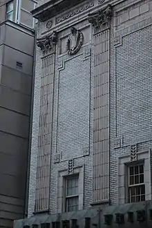 The auditorium's upper stories are divided into three vertical bays, separated by four fluted terracotta pilasters with composite-style capitals. The central bay contains four windows at the second story, while the outer stories each contain one window. All of the second-story windows are six-over-six double hung windows, placed within terracotta surrounds. Above these windows, there are rectangular brick panels at the third and fourth stories, with terracotta floral decorations at each corner. A lighted sign with the theater's name is placed in front of the central bay's panel. The outer bays are topped by short, rectangular terracotta panels, which contain cartouches with molded wreaths. Similar rectangular terracotta panels are placed above the center bay. These are surrounded by bands of stretcher brick.[16]