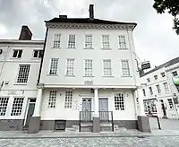 The house was built on the corner of Breadmarket Street and Market Street in 1707 by Johnson's father, Michael. The house is built of timber frame and brick infill, now covered in stucco.[1] It is in a Palladian style with four storeys, the top storey being lit with dormer windows which were removed in the 18th century and restored in the 1970s.[3] The front of the house faces onto the Market Square and on this side the upper storeys are jettied outwards over the ground floor.[3] As built this projecting front was supported at each end by a plain pillar, these continued upwards on the corners of the upper storeys by pilasters of the Ionic order.[3] The facing of the house was red brown brick and the roof tiles were blue black. In the 18th century two central pillars were added and one was removed in the late 19th century. In the 19th century the pilasters were removed and the outside was stuccoed.[3]