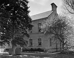 The Hoyt House is a 2+1⁄2-story house in the Georgian style, built in dressed and coursed ashlar sandstone. According to its entry on the National Register of Historic Places, it is the finest example of Georgian-style architecture in Utah. It has a center-passage double-pile plan, two rooms deep, five bays across the front. The hall ends at a formal dining room, and is flanked by sitting and service rooms. The house has 14 rooms, nine of them with fireplaces. The main living level features murals by a local artist named Olson. A full basement includes a well, near the basement kitchen, which in turn was connected to the upstairs by a dumbwaiter.[2]