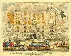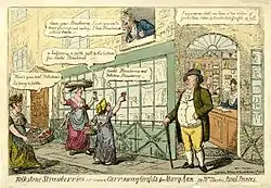 Samuel William Fores, often credited as S. W. Fores (1761 – 3 February 1838) was an English illustrator and publisher/printer based in Piccadilly, London.[1] Fores, the son of a cloth merchant, began his career publishing his illustrations in 1783. He operated from premises at No 3 Piccadilly from 1785 and moved to 50 Piccadilly from 1795.[2] He specialised in caricature, typically hand-coloured, singly issued prints.[3][4] He became successful at marketing his works, which he often sold wholesale.[4] Fores acquired a particularly large collection of caricatures, and at one time was said to have "the completest collection in the kingdom" in his Caricature Museum.[5] He died in February 1838 at the age of 77 and was buried in his family vault at St. James Church in Jermyn Street.[6]