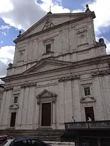 The church was begun in 1640, using designs by Loreto Scelli, and consecrated only in 1724. The stone façade has varied tympani over the doors and windows, and the verticality is accentuated by corinthian pilasters. The interior has paintings by Gaetano Lapis, Sebastiano Conca, Pietro Labruzzi and Francesco Refini.[1]