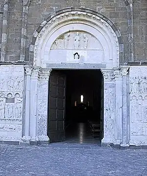 The church has the typical structure of the Cistercian basilicas, with a nave and two aisles separated by ogival arches and wooden ceiling. The main façade is characterized by a large marble portal (called Portale della Luna, "Moon portal"), decorated with high-reliefs and other re-used material. On the southern side are the Portale delle Donne ("Women's Portal"), also with marble decorations, and the bell tower, which is now shorter than originally and which was also used as a defensive structure. Opposite to the façade are three apses, with arcade decorations and mullioned windows of Arabic influence.