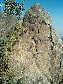 Possible representación dedicada al dios Xipe Tótec (náhuatl: xipetotec, ‘nuestro señor el desollado’‘xipe'ua, desollar, descortezar; to'ca, nosotros; tec'uhtli, señor’) Este comparado a una ilustración del códice Duran lamina 7Relieve ubicado justo abajo de las cruces del cerro de Texcolli en San Gregorio Atlapulco.
