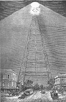 The San Jose electric light tower, also known as Owen's Electric Tower after its creator and chief booster, was constructed in 1881 at an intersection in downtown San Jose, California, as a "high light" or moonlight tower to light the city using arc lights. A pioneer use of electricity for municipal lighting, it was later strung with incandescent bulbs and was destroyed in a storm in December 1915. A half-size replica stands at History Park at Kelley Park.