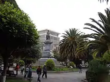 In the center of the city is the emblematic Montalvo Park. Named after the Ambato-born writer, Juan Montalvo, the park was built in 1905 and has served as a social gathering spot for the people of Ambato since. The park was designed by local architect Pedro Durini.[13] It lies at the meeting point of four important streets in Ambato: Montalvo, Sucre, Bolivar, and Castillo. It also sits in the shadow of the modern cathedral which has served as a symbol of the new Ambato. The statue of Juan Montalvo at the center of the park was built in Italy by Pietro Capurro. It was inaugurated in 1911. The mausoleum where Juan Montalvo is buried is just down the street. The park is currently undergoing a $450,000 renovation to restore the gates and walkways that surround the park.[14]