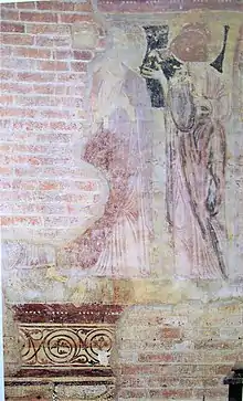 Although small in size, the building is a unitary work in terms of design and execution and represents a clear example of Lombard Romanesque.[5] The facade, like many other buildings in Pavia, is enriched by a blind loggia and Byzantine ceramic dishes dating back to the 13th century,[6] while some capitals of the mullioned window in the center of the facade date back to the Carolingian age.[7] The blind loggia decoration supported by small columns also runs along the north side of the church, where a second portal opens. The church has a single nave, and inside, and in particular in the apse area, there are fragments of frescoes dated to the first half of the thirteenth century.[8]