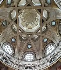 The architect Guarino Guarini was a great innovator in Baroque principles first developed by the great Roman Baroque architect Francesco Borromini, in particular the play with optical effects and organic "deconstruction" of the classical orders and principles of column and entablature. However, in San Lorenzo Guarini took these further.[2] The ground plan is a kind of square which becomes an octagon at the level of the entablatures above the columns only to change again to become a Greek cross at the level of the pendentives of the vaults. Again, the base of the dome is circular in plan yet the lantern above it octagonal. The dome itself is supported by eight ribs forming a lattice similar to those found in mosques and Romanesque churches in Spain. To this superposition of - by the standards of convention - contradictory central plans is added an elliptical choir. The high altar, separated from the nave by a convex and concave archway receives natural light from a hidden dome, devices drawn from the other key Roman Baroque architect Gian Lorenzo Bernini.[1]