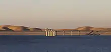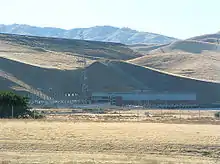 The San Luis Dam, a zoned compacted earthfill structure, is one of the largest embankment dams in the United States, with a structural height of 382 feet (116 m), a length of 18,600 feet (5,700 m) and a structural volume of 77,656,000 cubic yards (59,372,000 m3).[2][3] When full, San Luis Reservoir is more than 300 feet (91 m) deep, covers 12,700 acres (5,100 ha), and contains 2,041,000 acre-feet (2.518 km3) of water. The storage capacity of San Luis Reservoir is divided with 55 percent belonging to the state and 45 percent to the federal government.[8]