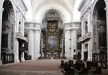 The interiors, in Baroque fashion, are elaborately ornamented with gilded stucco, and sport a number of lateral chapels. To the left of the entrance is a confessional with a canvas depicting a "Beatified Bishop" by Luigi Miradori. On the opposite side of the church is another confessional with a canvas by Giacomo Bertesi. The third altar on the right has an altarpiece depicting St Joseph and Child Jesus by Angelo Massarotti. At the end of the presbytery is a sculpted wood altar-frame by Bertesi, containing two canvases, used as a main altarpiece, depicting the St Marcellinus and St Peter the Exorcist baptizing the Jail-warden's daughter (1604) by Gervasio Gatti. Other artworks in the church include a canvas with a Crucifixion scene with the Madonna, Magdalen, John the Baptist, and Francis Xavier by Agostino Bonisoli; a St Ignatius of Loyola (1622) and a Transfer of the Relics of the Saints from the church of San Tommaso to the Cathedral by Angelo Massarotti; and a Life of Sant’Orsola and Presentation at the Temple (1652) by Luigi Miradori.[1]