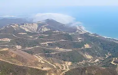 The predominant vegetation in the hills is chaparral and coastal sage scrub.[3] Terrain on the hills is steep, and the unpaved access roads make numerous switchbacks. Some of the hillsides are bare where landslides have stripped them, and the terrain in this area is unusually prone to landslides.