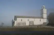A bell tower was located at the rear of the church. The lower courses of this were built out of well-polished hewn stones, and the tower was begun by local masters in the 15th century and completed by Lombard masters in around 1538. The bell tower was destroyed in an earthquake in 1859,[3] and it was later rebuilt. The lower part of the tower survived the 2016 earthquake.