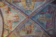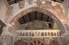 The floor of the right half of the church consisted of a schiazze paving dating back to 1528. This consisted of rectangular local stones of various sizes and colour shades. The roof was tiled on the left side and had cross vaults and ribs on the right. An immersion baptismal font, which might have been a Roman altar, was moved to the parish house in the early 1970s to protect it from theft.[7] The left aisle of the church was richly decorated with frescoes and a loggia with an iconostasis. The frescoes were the works of a number of artists, including Giovanni and Antonio Sparapane, Nicola d'Ulisse and Domenico di Jacopo. The right aisle was not richly decorated, but its floor was engraved with an unrealized project for a bell tower.[2]