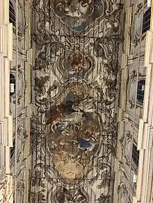 The facade had merely been completed at the first story, when the highly decorated upper floors were erected under the designs of Nicolò Sapia. In 1702 the surrounding loggia was erected. The bronze and wooden portal doors of the facade were designed in the 20th-century by Domenico Girbino. The wooden ceiling was painted by Olivio Sozzi with a Triumph of the Faith.[1]