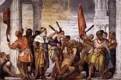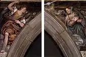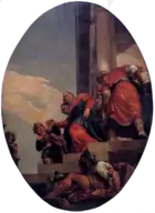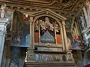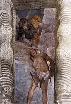 The nave's sectioned ceiling contains three paintings depicting episodes from the Book of Esther which Veronese completed in 1556. The paintings behind the choir depict the life of St Sebastian to whom the church is dedicated. The organ doors and frontal contain three pieces: The Presentation of Jesus in the Temple; The Washing of Sacrificial Animals in the Temple; and The Nativity.[4] Veronese also painted an Assumption of the Virgin in the cupola but this was destroyed in the 18th century.[6]