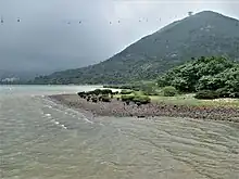 San Tau Beach Site of Special Scientific Interest (SSSI) along Tung Chung Bay. The Ngong Ping 360 gondola lift is visible in the upper part of the picture.