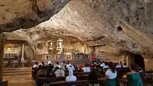 The archaic cavern opening to the left, with its holy well, is full of votive offerings, especially the 12th century marble bishop's throne supported on crouching lions.[7] Among the ex voto objects is a statue of the Archangel by Andrea Sansovino.