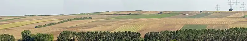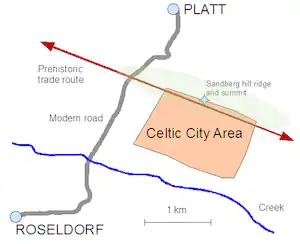 The Sandberg ridge (situated at 48°39′0″N 15°58′0″E / 48.65000°N 15.96667°E) separates the villages of Platt and Roseldorf in the district of Hollabrunn. It consists almost entirely of fertile Löß soil and has been subject to intense agricultural use for centuries. Its summit, although not high, offers a panoramic view far into the surrounding countryside, suggesting strategic considerations might have played a significant role in the selection of the location. While the inhabited area (as far as it has been delineated by surveys) was situated on the southern slope of the hill on the territory of Roseldorf, Platt has much better logistic connections and traditionally harbors the archeologists' base camp.