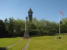 The setting is one of the most elaborate for Lutyens' war memorials. The clock tower rises behind the cross on its main axis, while parallel strips of Portland stone leading out from each side of the base form a large cross in the grass. The tip and arms are terminated by stone benches, while the foot is terminated by a circular flower bed, which is itself bordered by Portland stone.[1][3]