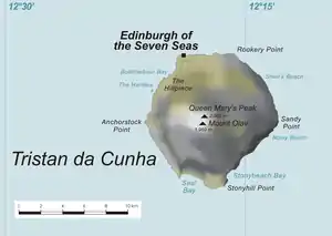 Sandy Point is the easternmost extremity of the island of Tristan da Cunha in the South Atlantic Ocean. It is a distance of about 7 miles (12 km) by sea from the island's only settlement, Edinburgh of the Seven Seas. There is a beach of black volcanic sand fringed by low cliffs and a sloping plateau leading up to Tristan's mountainous interior. Its climate is warmer and drier than that of the Settlement, being in the lee of the island's prevailing winds.