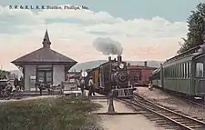 As part of the New England transportation monopoly organized by the New York, New Haven and Hartford Railroad, the SR&RL operated as a subsidiary of the Maine Central Railroad from 1912 until receivership in 1923.[4] Maine Central built 37 box cars, 37 flat cars, 3 cabooses and a baggage-RPO car in their Portland Terminal Company shops for the SR&RL between 1912 and 1917.[5] SR&RL locomotives 15, 16, 17 and 18 were reboilered in the Maine Central Waterville shops during the same period, and a 4-mile (6.4 km) freight branch was built from Perham Junction to Barnjum.