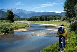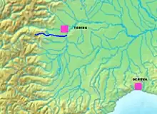 Starting at some 2000 m above the sea level in the Cottian Alps, it runs through the Val Sangone, between the Val di Susa (north) and the Val Chisone (south). It subsequently flows between the comuni of Coazze and Giaveno, then near Trana, and then enters the plain of Turin. After passing through the territories of Orbassano, Beinasco, Rivalta di Torino and Nichelino among the others, the Sangone enters the Po River between Turin and Moncalieri, at 220 metres (720 ft).