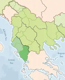The Sanjak of Ioannina consisted of the following kazas: the central kaza of Ioannina, Aydonat (modern-day Paramythia in Greece), Filat (modern-day Filiates in Greece), Megva (modern-day Metsovo), Leshovik (modern-day Leskovik in Albania), Konice (modern-day Konitsa), Pogon (modern-day Pogon/Pogoni on the present Greek-Albanian border), and Permedi (modern-day Përmet in Albania).[1][2]