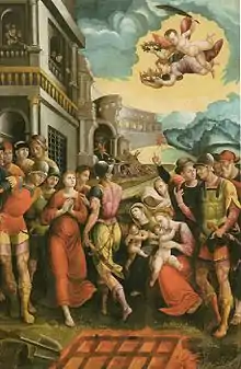 The interior of the church contains a silver chest with her relics, and lava slabs putatively with imprints of her small feet. A placard at the entrance to the prison explains that she stood here, before pushed into her prison cell. The crypt-like putative prison-cell houses a marble statue of a triumphant and healed Agatha. The main altarpiece is a depiction of the Martyrdom of Saint Agatha by “Bernardino Niger grecus” (1588). The painting depicts the Ancient Roman amphitheater in Catania behind the saint, part of which has been uncovered in Piazza Stesicoro in front of the facade of the adjacent Sant'Agata alla Fornace. [1] A bejeweled half-bust of a plump Agatha, kept in this church is paraded across the city in procession during the Festival of Saint Agatha every February 3-5.