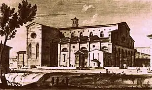 The architect was Leonardo Murario, called il Rocalica, and was built between 1226 and 1275 under the patronage of Nicolò di Boccassio, Bishop of Padua and future pope Benedict XI. Many members of the Carrara family, lords of Padua during 1318 to 1405, were buried here.[1] Their tombs were moved to the church of the Eremitani prior to demolition. Some of the columns were reused by the architect Giuseppe Jappelli, in the building now used by the Liceo Artistico Pietro Selvatico. The building is now the caserma Piave, where a fragment of a fresco by Guariento, originally in the church was discovered.