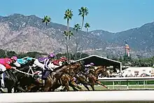 The Santa Anita track is set against the backdrop of the San Gabriel Mountains.