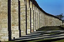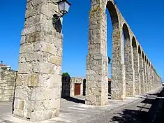 The artificial canal extends from the convent to the spring, an extension formed by 999 arches.[1][2] Of the original structure, a great part of the early aqueduct has been weakened over time, not including the segment from the Church of Santa Clara until the municipal limits, an extension of 500 metres (1,600 ft) of 4 kilometres (2.5 mi).[1][2] The aqueduct has a decreasing arcade span and height, with pointed arches and a rounded upper channel profile.[1][2]