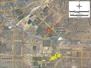 The field is within the Oxnard Plain, a rich agricultural region subject to encroachment from urban development from the cities of Oxnard, Ventura, and Camarillo. Oil production and storage equipment are surrounded by agricultural fields and orchards. Crops grown nearby include onions, broccoli, and strawberries. U.S. Highway 101 runs along the south edge of the oil field, and Santa Clara Avenue runs through it from southwest to northeast, ending at California State Route 118. The unincorporated town of El Rio is west of the field, and the unincorporated development of Nyeland Acres lies to the south, adjoining Oxnard. The total surface area of the productive part of the field is 180 acres (73 ha).[2]