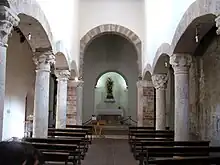 The church was erected over an 8th-century structure, likely once an ancient Roman Temple dedicated to Bacchus. The structure has three naves, subdivided by heavy rounded stone arches with capital with allegorical figures. The entrance portal, dated to the 12th century, has medieval sculptural stone decorations, including a Christ Blessing. Medieval frescoes were discovered during restorations in the 1960s.[1]