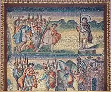 Santa Maria Maggiore, one of the first churches built to celebrate the Virgin Mary, was erected in the immediate aftermath of the Council of Ephesus of 431, which proclaimed Mary Mother of God. Pope Sixtus III built it to commemorate this decision.[27][28] Certainly, the atmosphere that generated the council gave rise also the mosaics that adorn the interior of the dedication: "whatever the precise connection was between council and church it is clear that the planners of the decoration belong to a period of concentrated debates on nature and status of the Virgin and incarnate Christ."[29] The magnificent mosaics of the nave and triumphal arch, seen as "milestones in the depiction" of the Virgin,[30] depict scenes of her life and that of Christ, but also scenes from the Old Testament: Moses striking the Red Sea, and Egyptians drowning in the Red Sea.