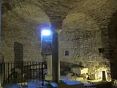 The crypt, belonging to the 10th-century church,[2] is home to Roman architectural elements, such as decorated walls, pavements, capitals from "Propertius' Domus", and a sarcophagus with a sculpted cross, dating from the 9th century. From the annexed garden remains of the ancient city's walls can be seen.