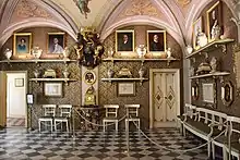 The premises on the Via della Scala in Florence house several historic sales rooms, a tea room, and a museum and library dedicated to the history of the pharmacy. An average of 2,000 visitors per day visit the shop. The main sales room occupies a former chapel, with allegorical frescoes of the four continents painted by Paolino Sarti decorating the vaulted ceilings. The old sacristy is decorated with frescoes by the early-Renaissance artist Mariotto di Nardo, painted in 1380.[3] The Green Room houses displays of wax products, room fragrances, accessories, and men's grooming products. The Old Pharmacy (Antica Spezieria) displays the full range of medicaments and elixirs, foods including biscuits, chocolate, tea, and honey, and the pharmacy's famous liqueurs like Alchermes and Liquore Mediceo.[4] The museum and its exhibits are housed in the Old Laboratories of the Via della Scala premises, containing ceramic and earthenware jars from the 16th and 17th centuries, historic soap machines, and traditional tools. The library is housed in the old sacristy of the church, and includes medieval recipe and reference books.