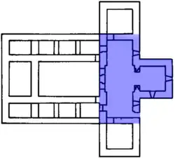 A basic plan of the church. The area shaded in blue still stands and is covered by a modern wooden roof. The non-shaded areas are ruined foundations. (Iñiguez, 1955)[13]