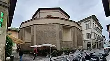 Copies of original plans and descriptions give us a good indication of Brunelleschi's intentions. The building was to have an octagonal, domed space at its core, surrounded by eight ancillary spaces.[6] Though the outside - as it was restored - has little similarity with what Brunelleschi intended, on the inside one can see how some of the original spaces were arranged.